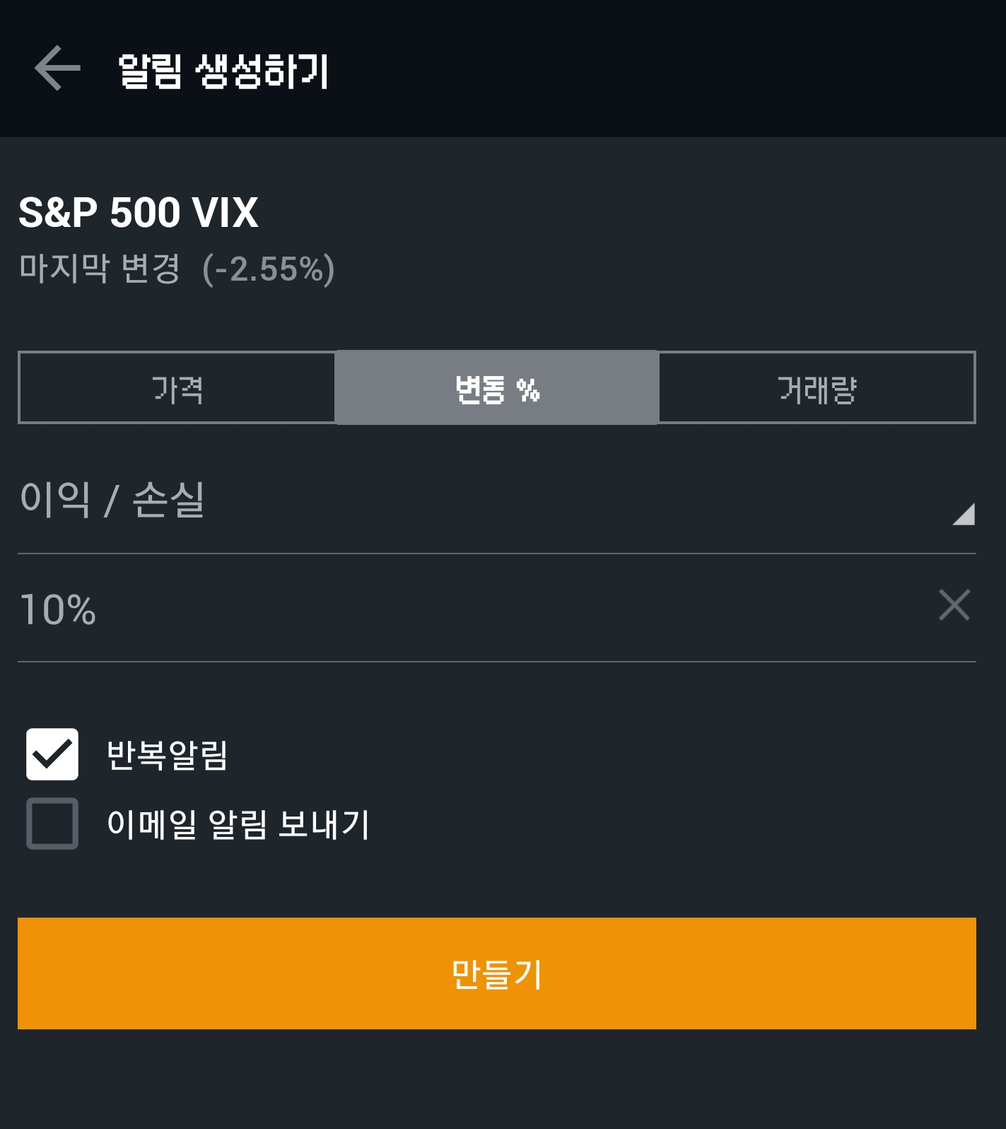 이렇게 VIX 지수가 10% 이상 변동성이 발생할 때 알림이 오도록 설정을 해놓았습니다.