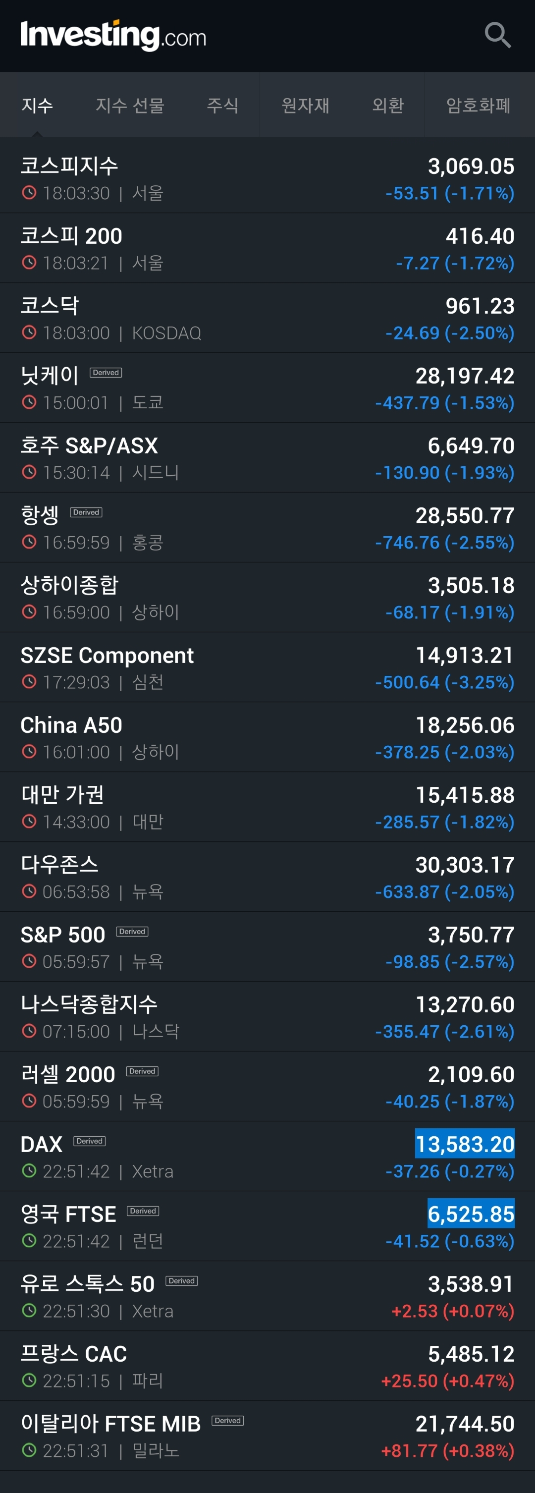 딱 보았을 때 다른 글로벌 시장들의 지수 상태가 심상치 않다는 건 바로 느껴집니다. (콧구멍이 커지고 가슴이 벌렁)