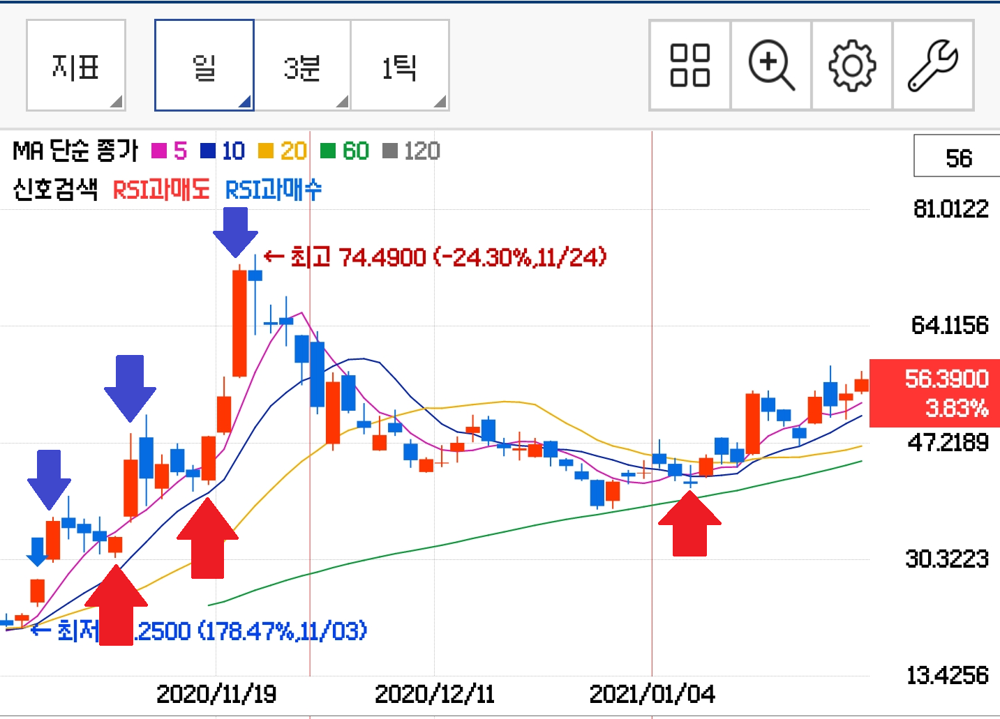 빨간색 화살표로 표시한 부분은 매수해도 좋다고 생각하는 구간입니다.